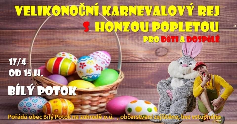V Neděli 17. dubna od 15.00 hodin se na zahradě obecního úřadu Bílý Potok koná velikonoční karnevalový rej. Občerstvení zajištěno, bez vstupného. Pojďme si společně zpříjemnit Velikonoce. V kostýmech mohou přijít děti i
