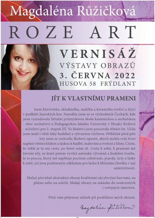 Magdaléna Růžičková vás v pátek 3. června 2022 od 17.00 hodin zve na svoji první vernisáž výstavy obrazů, která bude součástí otevření psychoanalytické praxe Šárky Nemešové.