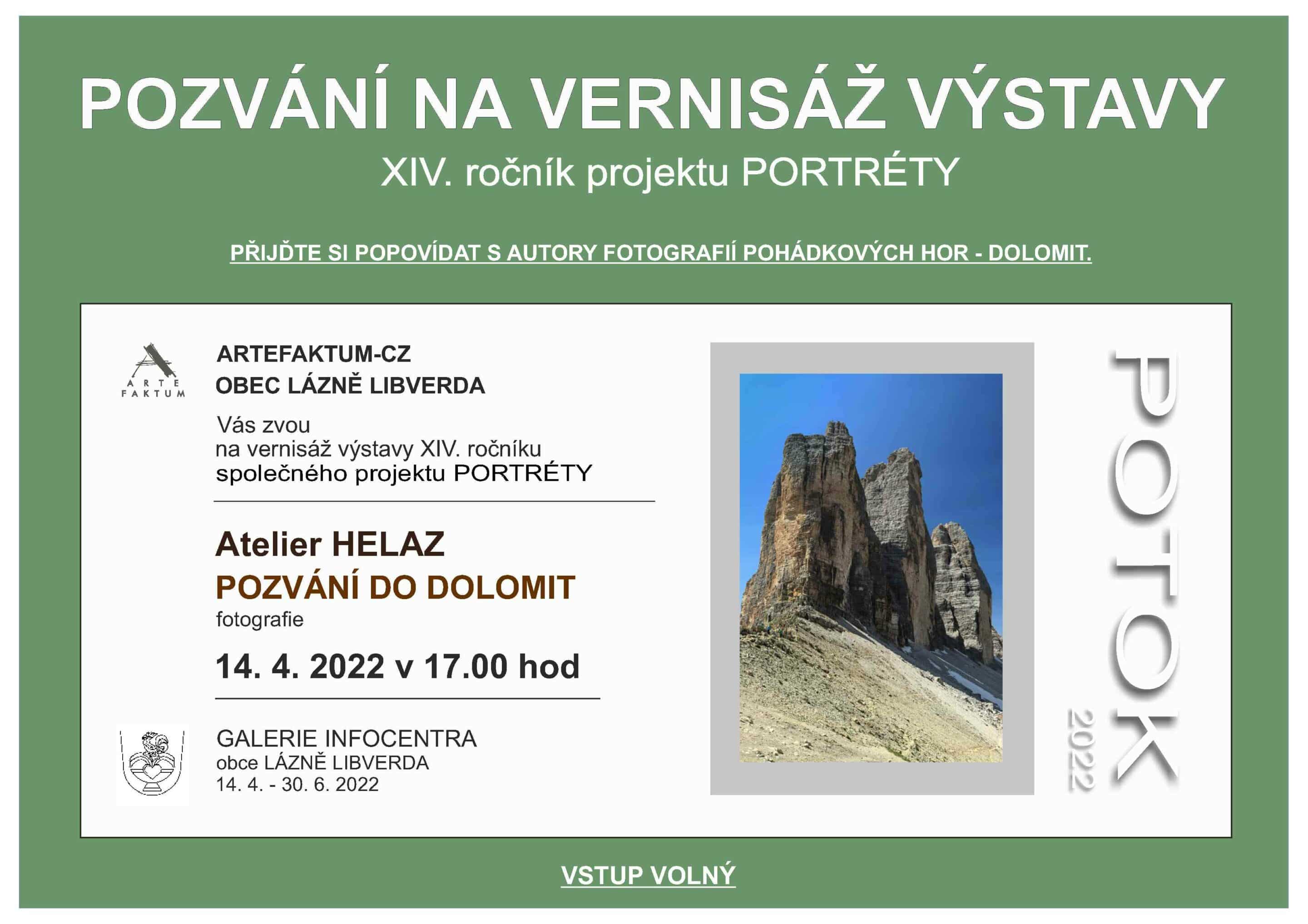 Artefaktum – cz a obec Lázně Libverda vás zvou na vernisáž výstavy XIV. ročníku společného projektu Portréty. Vernisáž výstavy Pozvání do Dolomit – Ateliér Helaz se koná v prostorech galerie infocentra