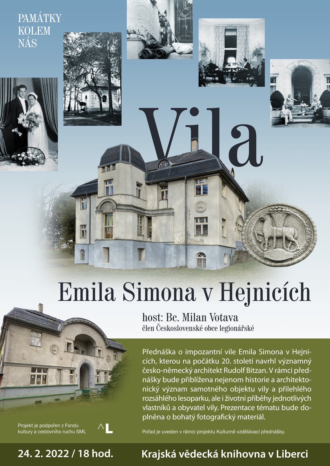 Host: Bc. Milan Votava – člen Československé obce legionářské přednáškový cyklus Památky kolem nás Přednáška o impozantní vile Emila Simona v Hejnicích, kterou na počátku 20. století navrhl významný českoněmecký