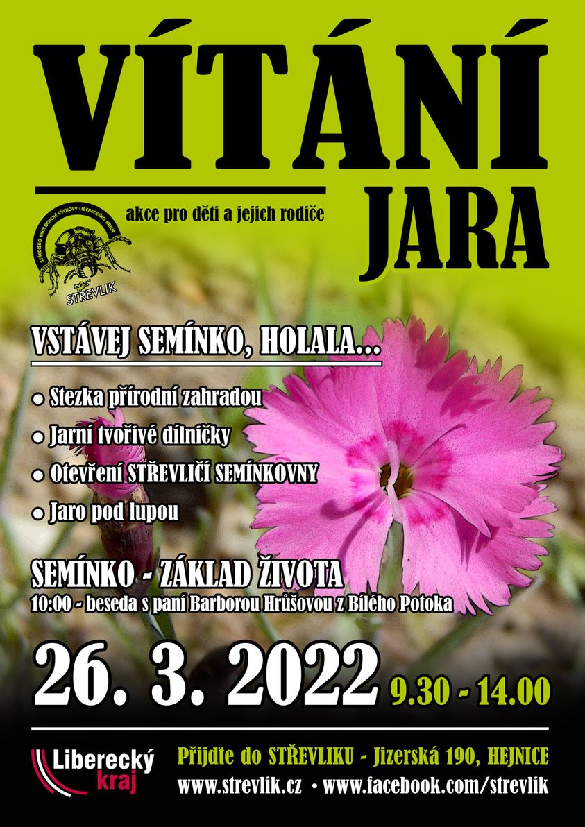 Přijďte s námi 26. března 2022 od 9.30 do 14.00 hodin přivítat probouzející se jaro do Střediska Ekologické Výchovy Libereckého Kraje Střevlík v Hejnicích. Společně otevřeme Střevličí SEMÍNKOVNY. S paní Barborou Hrůšovou