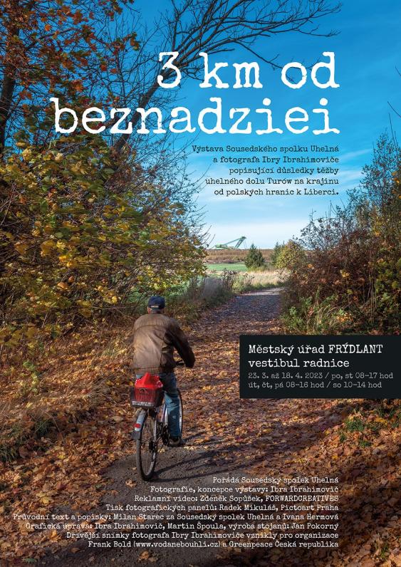 Snímky fotografa Ibry Ibrahimoviče a Sousedského spolku Uhelná, které ukazují důsledky těžby v hnědouhelném dole Turów na krajinu od polských hranic směrem k Liberci, jsou k vidění až do 18. dubna ve vestibulu radnice ve Frýdlantu. Výstava nazvaná „3 km od beznadziei“ je přístupná každý všední den od 8.00 do 16.00 hodin, v pondělí a ve středu do 17.00 hodin. V sobotu pak od 10.00 do 14.00 hodin. Přístupná je zdarma.
