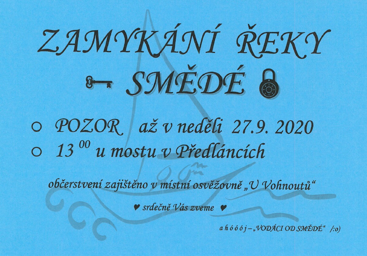 2020ne27září13.0016.00Zamykání řeky SmědéPředlánce, Višňová, Liberec Region, Czechia13.00 - 16.00(GMT+02:00) Druh akceSport,Veřejná akce