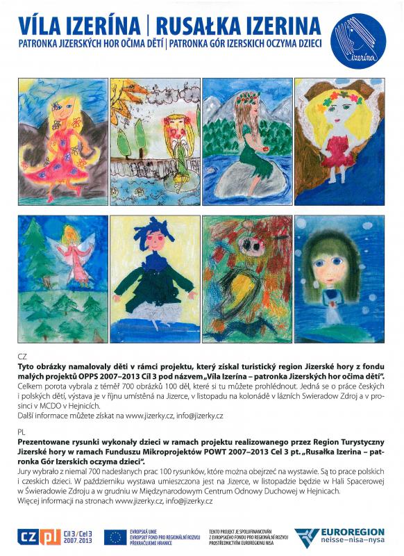 LÁZNĚ LIBVERDA – Víla Izerína, patronka Jizerských hor očima dětí – V průběhu loňského léta malovaly děti z české i polské strany Jizerských hor obrázky na téma Víla Izerína, patronka Jizerských hor. Z téměř 700 obrázků bylo odbornou porotou vybráno 100 dětských prací, které si mohli návštěvníci v průběh října prohlédnout na Pyramidě a v Panském domě na Jizerce, dále pak v listopadu na kolonádě v lázních Świeradów-Zdrój a v prosinci v MCDO v Hejnicích. Nyní jsou obrázky až do dubna vystavené v Centru Babylon. V březnu budou další, ještě nevystavené obrázky zkrášlovat vestibul jablonecké radnice. V červenci a srpnu se zahalí do vílích obrázků prostory věže jablonecké radnice, kde zpříjemní návštěvníkům přístup na ochoz, který je jako každý rok zpřístupněn o prázdninách veřejnosti. Tento projekt vznikl díky podpoře fondu malých projektů OPPS 2007-2013 Cíl 3 pod názvem „Víla Izerína – patronka Jizerských hor očima dětí“.
