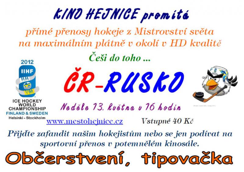 HEJNICE – V neděli 13. května od 16 hodin je v kině Hejnice na programu další promítání hokejových utkání z právě probíhajícího mistrovství světa. Tentokrát soupeřem České republiky bude tým Ruska. Těšit se můžete na nejvetší plátno v regionu, HD kvalitu přenosu a občerstvení s tipovací soutěží