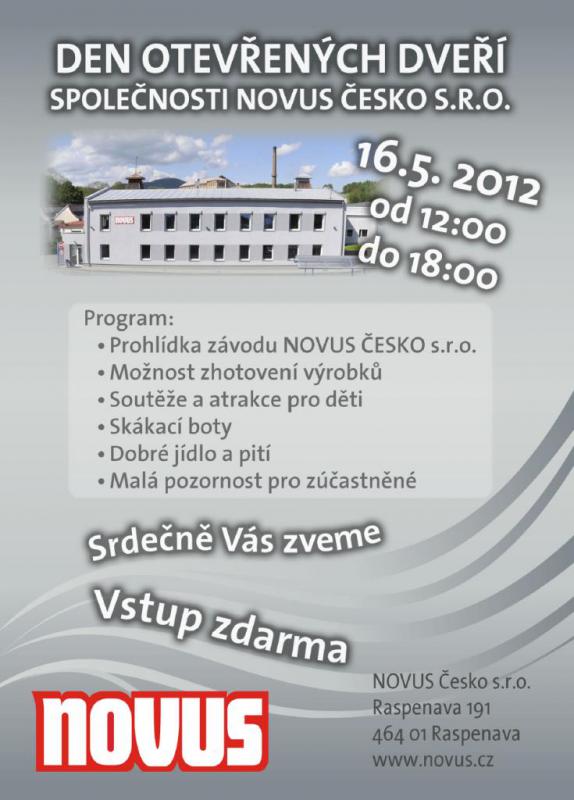 HEJNICE – Ve středu 16. května se mezi 12 a 18 hodinou koná den otevřených dveří v raspenavském závodě NOVUS CZ. Těšit se můžete na prohlídku závodu, možnost zhotovení výrobků, soutěže pro děti a dobré jídlo a pití. Všichni jste srdečně zváni.