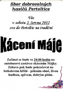 PERTOLTICE – Sbor dobrovolných hasičů Pertoltice Vás v sobotu 2. června 2012 zve do Pertoltic na tradiční KÁCENÍ MÁJE. Začínat se bude ve 20:00 hodin na autobusové zastávce skácením Májky. Zábava pak bude pokračovat na fotbalovém hřišti – pálením ohně, živou hudbou, zpěvem, dobrým pitím.