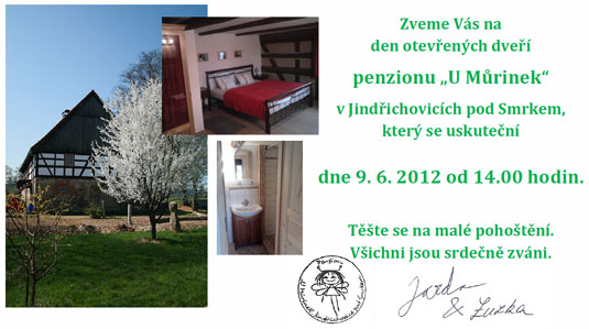 JINDŘICHOVICE POD SMRKEM – Zveme Vás na den otevřených dveří penzionu „U Můrinek“ v Jindřichovicích pod Smrkem, který se uskuteční dne 9. 6. 2012 od 14.00 hodin.