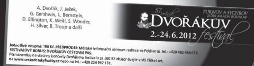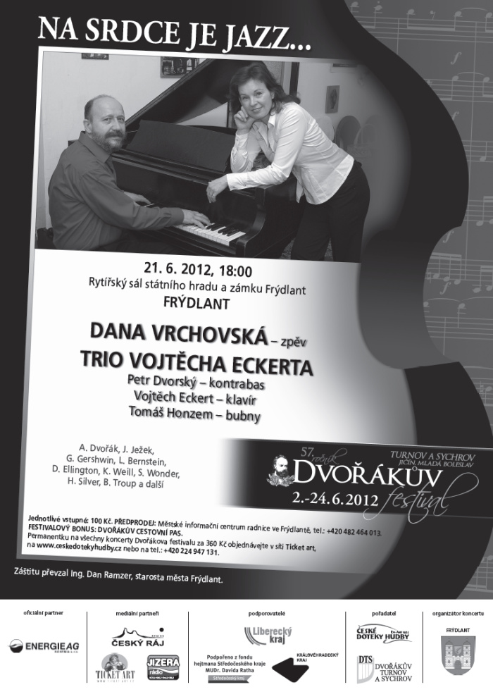 FRÝDLANT – Dvořákův festival 2012. V rámci Dvořákova festivalu proběhne dnes 21.6.2012 od 18.00 koncert pod názvem: “ Na srdce je jazz…“. Dana Vrchovská a trio Vojtěcha Eckerta vystoupí v Rytířském sálu hradu a zámku Frýdlant.