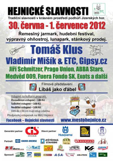 Plakat Hejnice 20121HEJNICE – Již tento víkend zažijí místní i přespolní další ročník Hejnických slavností. Bohatý kulturní program v čele s Tomášem Klusem před Perunem doplní řemeslný jarmark před bazilikou a stánkový prodej přes celé město včetně lunaparku u školy. Večerní oblohu v sobotu ozáří výpravný ohňostroj na téma Hejnice…
