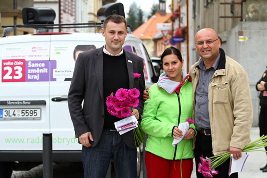 FRÝDLANT / STAROSTOVÉ PRO LIBERECKÝ KRAJ – V rámci předvolebního boje o náš kraj jste mohli dnes zahlédnout některé své starosty z Frýdlantska, kandidující za hnutí Starostové pro Liberecký kraj, jak rozdávají květiny kolemjdoucím na náměstí T. G. Masaryka ve Frýdlantě. Této netradiční akce se zúčastnil i kandidát na hejtmana a starosta Hrádku nad Nisou Martin Půta. Podívejte se na obsáhlou fotogalerii.