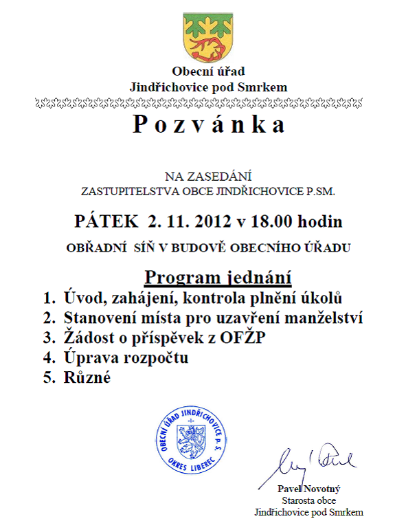 JINDŘICHOVICE POD SMRKEM – Zastupitelstvo obce Jindřichovice pod Smrkem Vás srdečně zve na zasedání obce, které se bude konat v pátek 2. 11. 2012 od 18 hodin v obřadní síni Obecního úřadu.