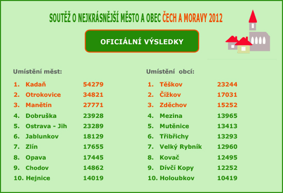 HEJNICE – Město Hejnice zabodovalo v letošním ročníku soutěže Nejkrásnější město a obec Čech a Moravy 2012 a získalo krásnou 10. příčku. Celkem obdrželo přes 14 tisíc hlasů a jako jediný zástupce Libereckého kraje se dostalo do první desítky. Děkujeme všem hlasujícím za takovou podporu.
