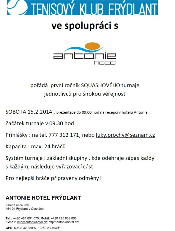 Kde? SPORT Concept v hotelu Antonie.Kapacita maximálně 24 hráčů. Systém turnaje – základní skupiny, kde odehraje zápas každý s každým, následuje vyřazovací část. Přihlášky na tel. 777 312 171 nebo na luky.prochy@seznam.cz. Pro nejlepší hráče jsou připraveny odměny.