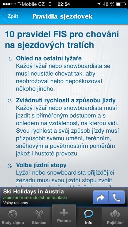 Horská služba ČR ve spolupráci s Českou pojišťovnou nabídla uživatelům chytrých telefonů, navštěvujícím naše hory, praktickou aplikaci obsahující informace o stanicích Horské služby, sněhové zpravodajství, FIS pravidla pro jízdu na sjezdovce, horské webkamery i průvodce první pomoci. Z pohledu turistů, ale i záchranářů je nejdůležitější funkcí možnost rychlého volání a odeslání nouzové SMS . Tato funkce není závislá na dostupnosti datového signálu, ale pracuje s lokalizací pomocí GPS. Aplikace dokáže odeslat na nejbližší stanici Horské služby nouzovou SMS zprávu s přesnou polohou telefonu.