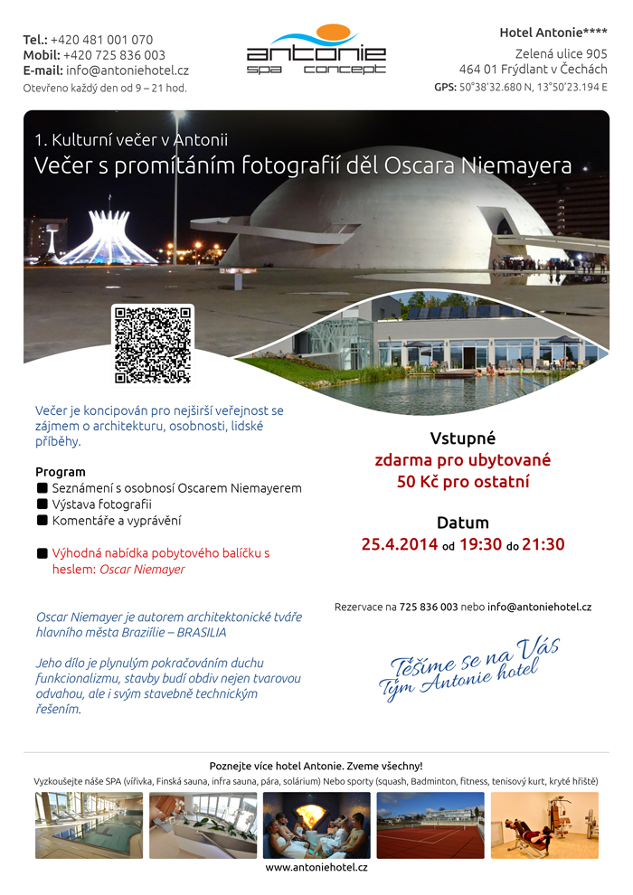 Zbrusu nový wellness, fitness, sport hotel ( tedy plavky, sportovní obuv, squashovou, badmintonovou či tenisovou raketu s sebou), pořádá na úvod víkendu 25. – 27. 4. 2014, tedy v pátek 25.4 od 19:30 kulturní večer na téma „Hold Oscaru Niemayerovi“. Jde o prezentaci zcela aktuálních fotografií de facto celoživotního díla geniálního brazilského architekta, na jehož rýsovacím prkně vznikla kompletní tvář všech budov „na zelené louce“ postaveného nového hlavního města BRASÍLIA v Brazílii.
