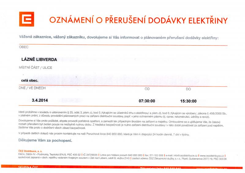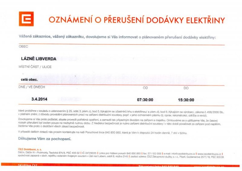 ČEZ distribuce a.s. oznamuje plánované přerušení dodávky elektřiny ve čtvrtek 3. dubna 2014 od 7.30 do 15.30 hod. v obci Lázně Libverda, týká se CELÉ OBCE.