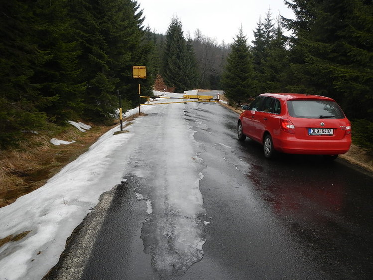Na konci přehrady, před stoupáním ke Smědavě, je totiž silnice stále pokrytá zledovatělou vrstvou sněhu v její celé šíři.