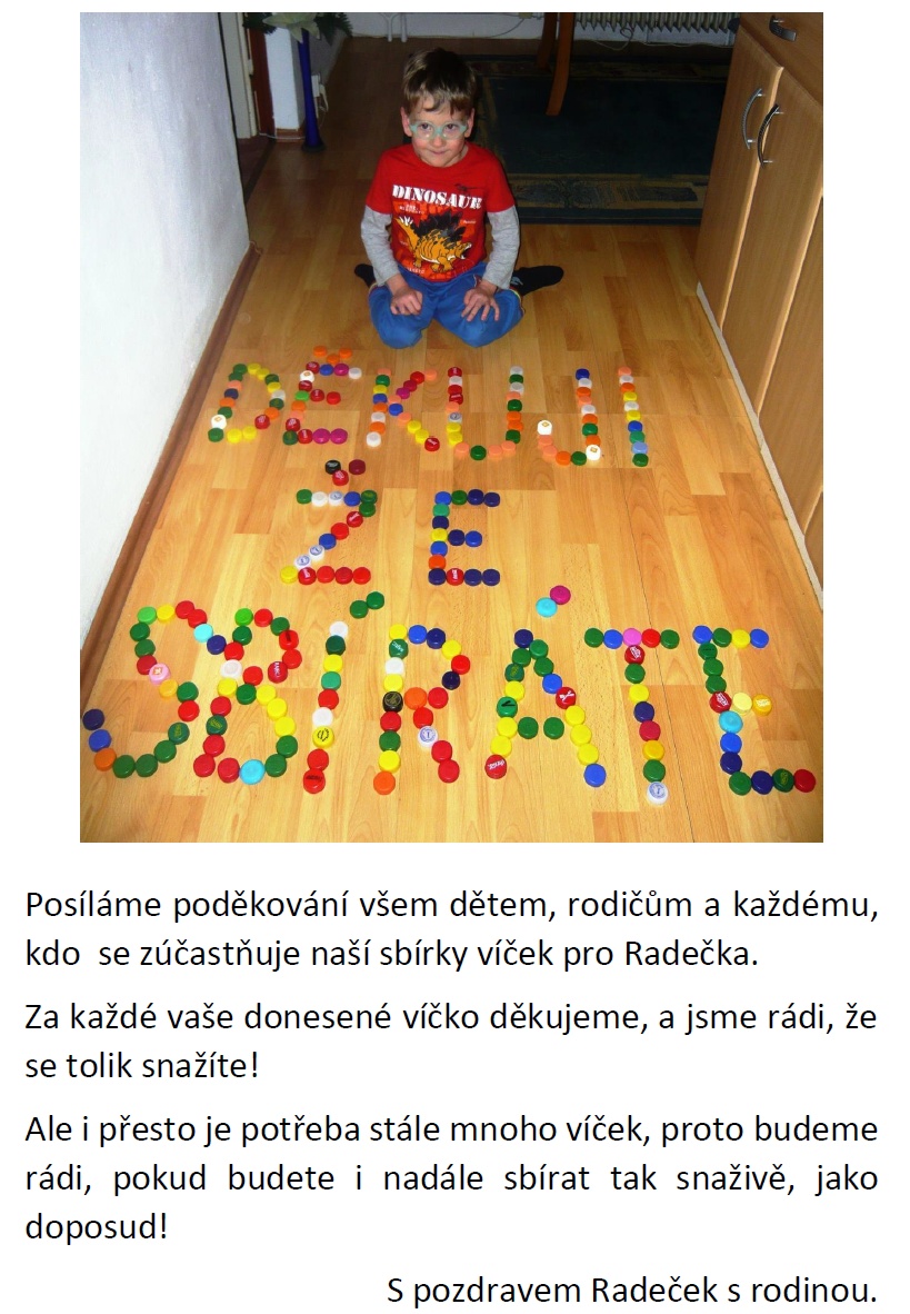 Sbírám víčka pro Radečka a už mám opravdu velký pyte. Kde mám víčka odevzdat?? Prosím odpovězte brzy. Děkuji Dvvořáčková L.Libverda