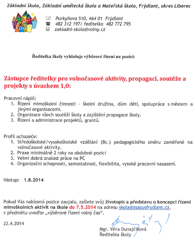 Zdroj: Základní škola, Základní umělecká škola a Základní mateřská škola, Frýdlant, okres Liberec