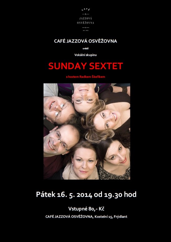 Dobrý den, zveme Vás na koncert do kavárny CAFÉ JAZZOVÁ OSVĚŽOVNA ve Frýdlantě, v pátek 16. 5.2014 od 19.30. Hraje – zpívá vokální skupina SUNDAY SEXTET,  jako host vystoupí Radek Škeřík, pravidelný návštěvník LJD a člen skupiny  TWO TOWER HULU JAZZ. Pro jistotu sezení prosím v případě zájmu o rezervaci místa.