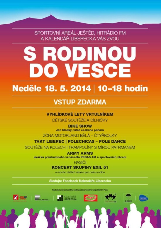 SPORTOVNÍ AREÁL JEŠTĚD, HITRÁDIO FM A KALENDÁŘ LIBERECKA VÁS ZVOU S RODINOU DO VESCE – pracovat a trávit čas s rodinou – tyto dvě důležité věci by měly být v rovnováze. V tomto duchu jsme pro všechny návštěvníky připravili den volnočasových aktivit. Vystoupí hudební skupina EXIL 51, taneční školička TAKT Liberec. Děti se mohou těšit na VYHLÍDKOVÉ LETY VRTULNÍKEM a ukázku průzkumného vznášedla PEGAS 4M a sportovních zbraní. Mohou si zaskákat na trampolínách s MÍROU PATRMANEM, zhlédnout BIKE SHOW Jana Sladkého vítěze českého poháru.