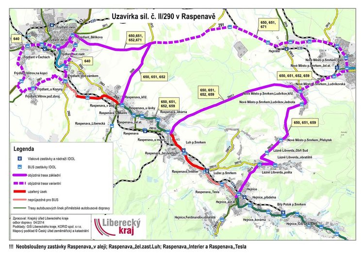 Vážení cestující, z důvodu pokračování rekonstrukce silnice Frýdlant – Raspenava – Hejnice – Bílý Potok (č. II/290) dojde v letošním roce k rozsáhlým uzavírkám v oblasti města Raspenavy, věnujte proto prosím pozornost níže uvedeným opatřením v autobusové i železniční dopravě.