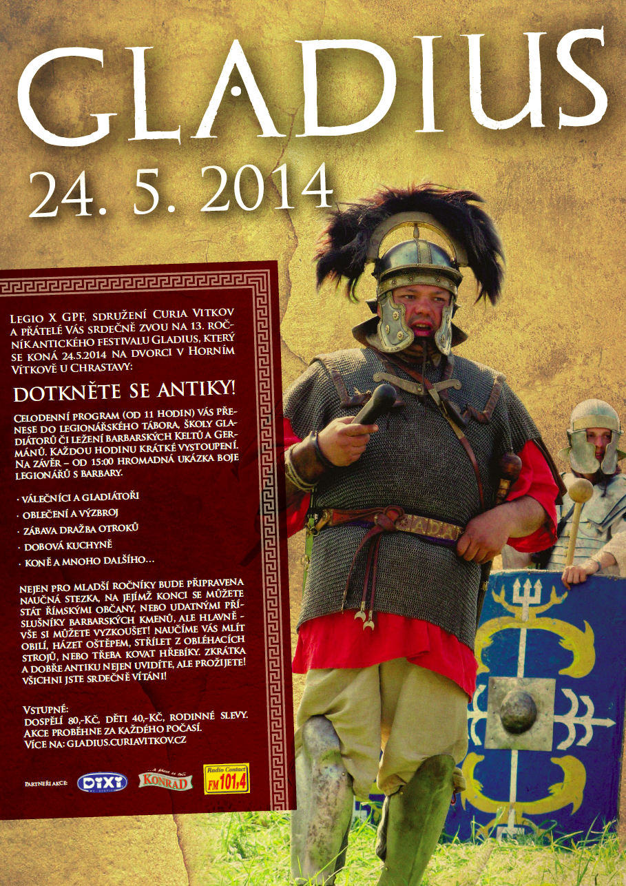 Během programu se Vám představí různé skupiny hist. šermu a reenactementu z celé České republiky a seznámí Vás poutavou akční formou s vojenstvím římských legií i pomocných sborů, starých Keltů či Germánů. Budete moci shlédnout gladiátorské zápasy a rozhodovat o osudu poražených bojovníků. Vy i vaše děti si budete moci vyzkoušet na vlastní kůži, ve zbroji antických válečníků, co obnášel kupříkladu těžký výcvik římského legionáře pod nelítostnou holí tvrdého centuriona. Ty z Vás, které tolik neoslovuje jen boj a válka budou jistě zajímat i některá starověká řemesla. Součástí programu bude i možnost prohlédnout si areál raně středověkého skanzenu Curia Vitkov.