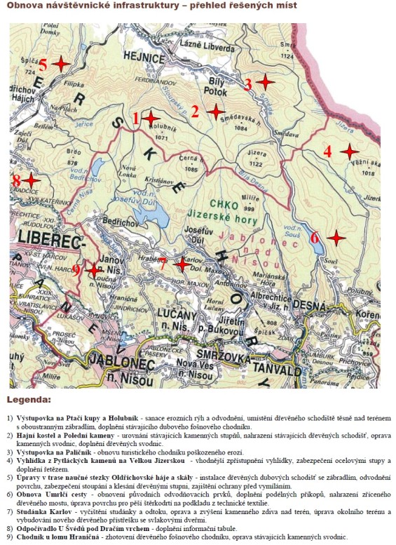 Projekt řeší výstupovou trasu na Ptačí kupy a navazující cestu na Holubník, výstupovou trasu Hajní kostel – Kozí stezka – Frýdlantské cimbuří – Polední kameny – Pavlova cesta, výstupovou trasu na Paličník, zabezpečení přístupu na vyhlídku z Pytláckých kamenů na Velkou Jizerskou louku, nezbytné protierozní úpravy v trase naučné stezky Oldřichovské háje a skály, obnovu zamokřelé Umrlčí cesty, opravu kryté studánky Karlov, doplnění odpočívadla U Švédů pod Dračím vrchem informační tabulí a obnovu zamokřelé cesty u lomu Hraničná.