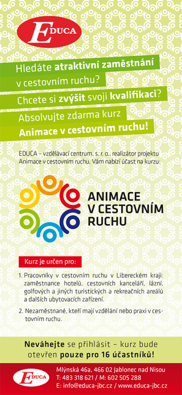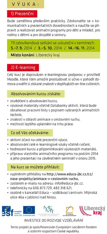 Prezenční výuka, která bude probíhat ve třech víkendových setkáních, bude zaměřena prakticky. Naučíte se připravit a realizovat výtvarně-dramatické, sportovní a kulturně-zábavné animační programy pro děti a mládež, pro rodiny s dětmi a pro dospělé a seniorů. Zdokonalíte se v komunikačních a prezentačních dovednostech. Kurz je doprovázen e-learningovou podporou. Bližší informace o kurzu i o celém projektu najdete na http://www.educa-jbc.cz/cz/nase-projekty/animace-v-cestovnim-ruchu
