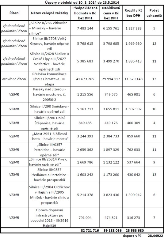 Předpokládaná hodnota všech 22 veřejných zakázek činila 110.232.257 Kč bez DPH. Vysoutěžené částky, resp. ceny dle smluv jsou ve výši 76.908.741 Kč bez DPH. Libereckému kraji to přineslo úsporu 30,23 % z původně stanovené hodnoty zakázek, tedy více než 33,3 mil. Kč.
