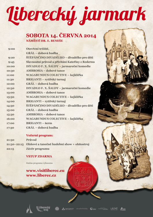 „Liberecký jarmark začne v 9.00 hodin otevřením tržiště. V 9.45 je očekáván příjezd a slavnostní přivítání Kateřiny z Redernu s její družinou. Až do 21.30 hodin, kdy program jarmarku uzavře ohňová a taneční show s ohňostrojem, si lidé užijí sérii vystoupení kejklířů, šermířů, hudebníků a tanečníků,“ láká náměstek primátorky Liberce Kamil Jan Svoboda. Připraveny jsou i jarmareční komedie a divadélko pro děti. Koupěchtiví návštěvníci si budou moci u trhovců vybrat tradiční keramické nebo proutěné zboží, batikované šátky, šperky, dřevěné loutky a meče, anebo staročeské koření. Chuťové buňky jim nasytí domácí koláčky, bramborové placky, klobásky nebo třeba medovina. Na regionální tržnici si budou moci koupit místní potraviny i řemeslné a další výrobky z našeho kraje.