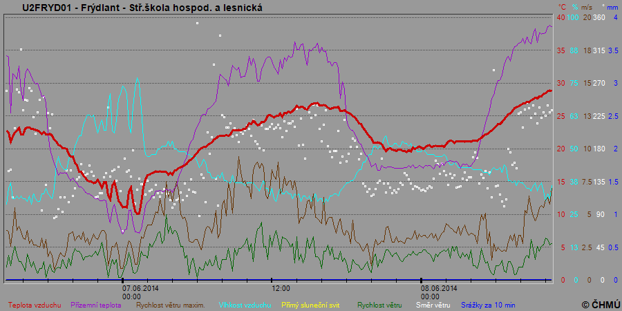 A co vlastně měříme? Tlak vzduchu (hPa), teplota vzduchu (°C), relativní vlhkost vzduchu (%), směr a rychlost větru (m/s), intenzita srážek (mm), přízemní teplotu (°C), půdní teplotu v pěti horizontech (5cm, 10cm, 20 cm, 50 cm, 100 cm), sluneční radiaci, dohlednost (m). Naměřená data jsou online dostupná na stránkách školy a dále zpracovávána, sestavují se nejrůznější grafy a tabulky, ale tato statistická činnost rozhodně není samoúčelná. Kvalitní a přesné přístroje, propojení s počítačem a zajištění pravidelného odečítání hodnot umožňuje sestavit takové soubory informací, které mladí meteorologové odesílají do ČHMÚ. Stávají se tak součástí sítě profesionálních i amatérských stanic, jejichž výsledky jsou po internetu dostupné k porovnání v jakékoli části republiky a slouží k monitorování globálních klimatických změn. Člověk nemusí být velkým odborníkem v oblasti meteorologie, aby si uvědomil, že dostatečné množství dat pořizovaných v pravidelném čase a na stejných stanovištích je nutné k odhalení odchylek a porovnání výsledků pozorování s jinými místy na Zemi. Z těchto srovnání potom vyplynou i obecnější závěry, které mohou pomoci odhalit např. skrytý zdroj znečištění vodního toku, změny počasí ovlivněné znečištěním ovzduší nebo inverzí. Pokud budeme mít dostatek přesných dat, snáze můžeme předpovědět výchylky počasí, které člověku komplikují život (bouřky, záplavy).