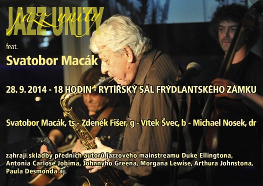 000001Jazz Unity a Svatobor Macák budou hrát skladby předních autorů jazzového mainstreamu. Vystoupí Svatobor Macák, Zdeněk Fišer, Vítek Švec a Michael Nosek. Koncert se koná 28. září v Rytířském sále od 18 hodin. Vstupné 120 Kč.