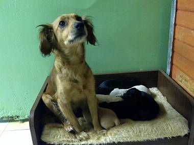 Fenka křížence nejspíš skončila opuštěná na ulici poté, co její původní majitel zjistil, že čeká štěňata. Narodilo se jich sedm. Nyní jim je něco málo přes týden. Více se dočtete zde.