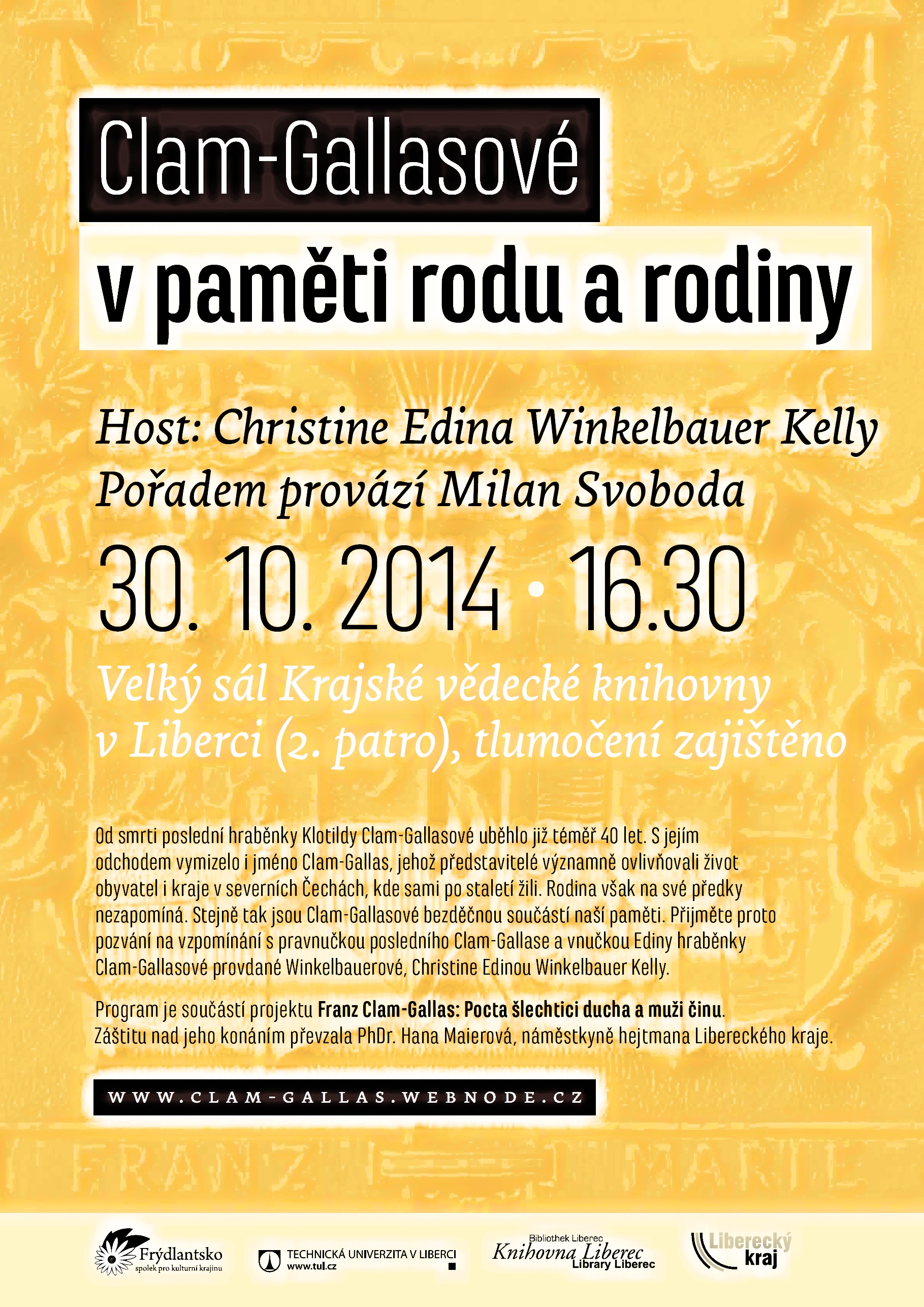 Stejně tak jsou Clam-Gallasové bezděčnou součástí naší paměti. Přijměte proto pozvání na vzpomínání s pravnučkou posledního Clam-Gallase a vnučkou Ediny Clam-Gallasové provdané Winkelbauerové, Christine Edinou Winkelbauer Kelly.“