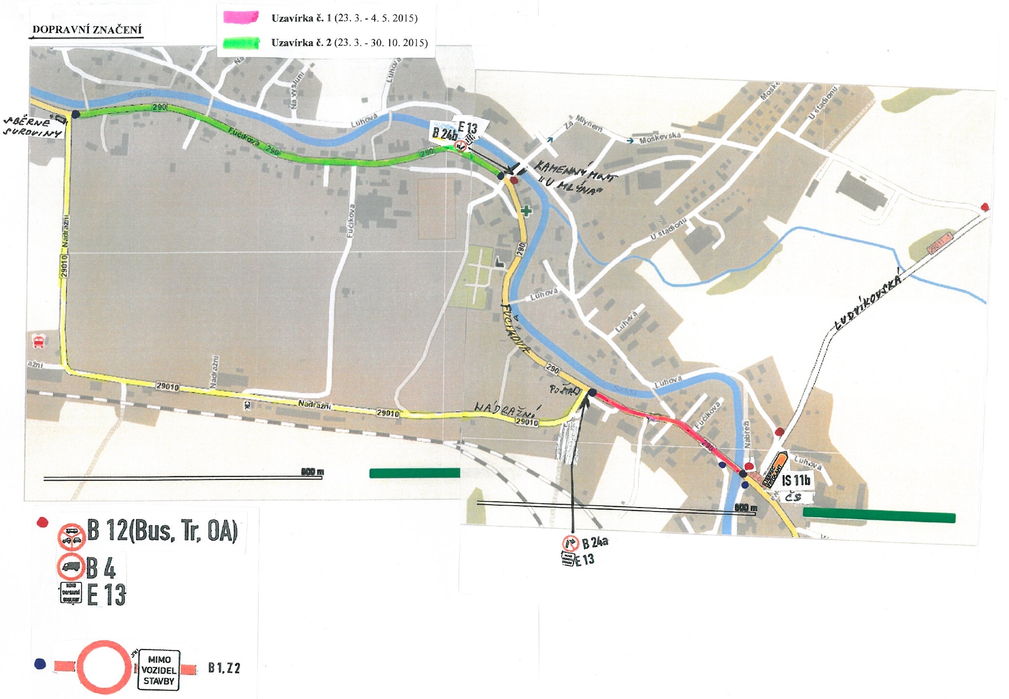 Uzavírka ul. Fučíkova (silnice č. II/290) – od kamenného mostu „U mlýna“ po křižovatku s ulicí Nádražní „sběrné suroviny“ (silnice č. III/29010). Postup prací bude prováděn ve směru od kamenného mostu po ul. Nádražní „sběrné suroviny“. Na kamenný most „U mlýna“ bude dopravní obsluze vjezd povolen.