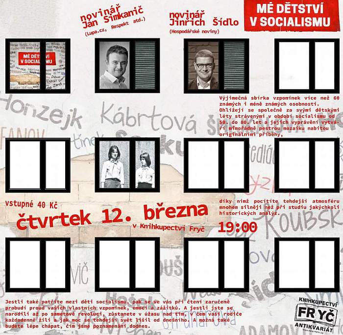Knihkupectví a antikvariát Fryč – čtvrtek uvítáme dva vzácné hosty – novináře Jindřicha Šídla a jeho kolegu, novináře a internetového publicistu Jána Simkaniče (mimo jiné otce ankety Křišťálová lupa). Přijedou si popovídat nad knihou Mé dětství v socialismu, ve které se sešly texty a postřehy desítek mimořádných osobností české kultury a společnosti. Nenechte si tento večer ujít, těšíme se na Vás 12. března od 19.00 hodin.