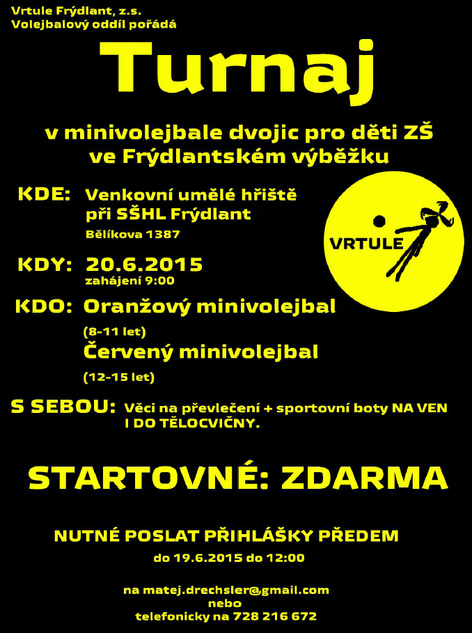vrtuleVrtule Frýdlant, z.s. – volejbalový oddíl – pořádá Turnaj v minivolejbale dvojic pro děti ZŠ ve Frýdlantském výběžku