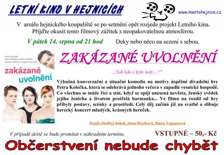 Hejnice – Další promítání letního kina na koupališti je v plánu tento pátek 14. srpna ve 21 hodin. Na programu je komedie Jana Hřebejka Zakázané uvolnění o jednom nevšedním únose nevěsty.