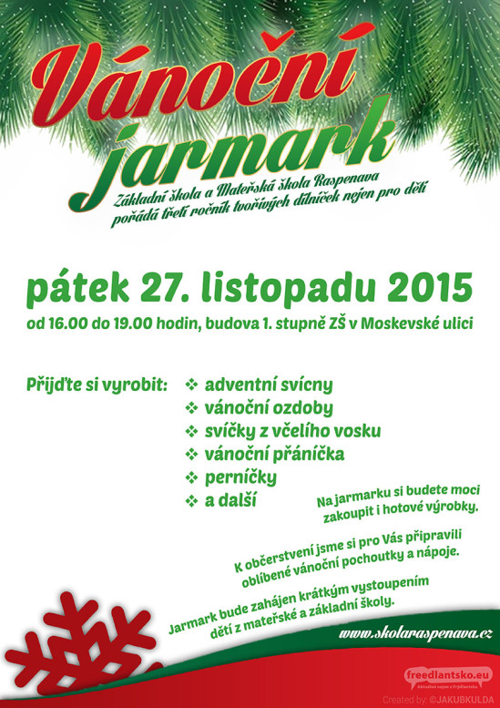 Základní škola a Mateřská škola Raspenava pořádá třetí ročník Vánočního jarmarku pro širokou veřejnost. Znovu s bohatou nabídkou výtvarných dílen nejen pro děti. Celý program zahájí krátké vystoupení dětí z mateřské a základní školy.