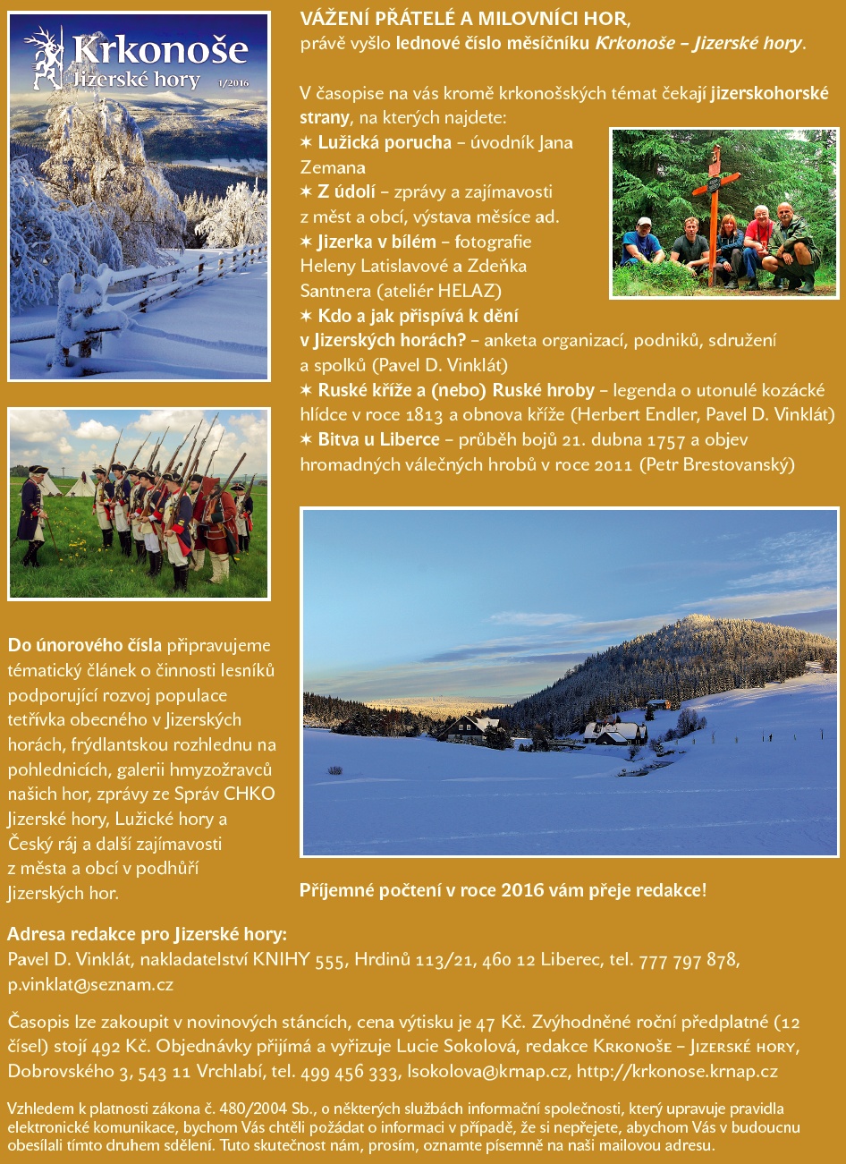 právě vyšlo lednové číslo měsíčníku Krkonoše – Jizerské hory. V časopise na vás kromě krkonošských témat čekají jizerskohorské strany, na kterých najdete: