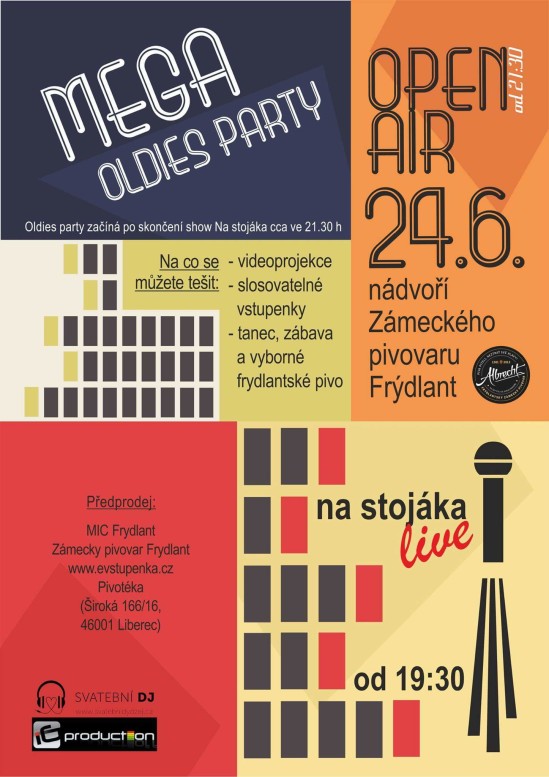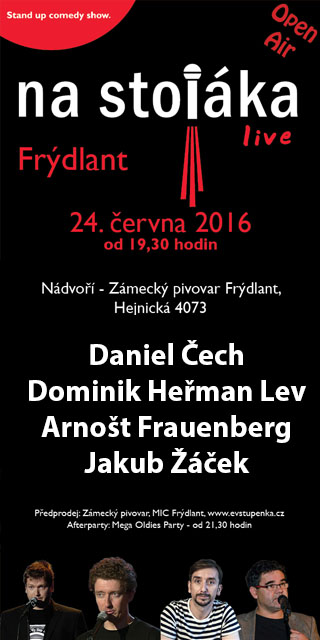 Originální česká “stand-up comedy” vychází z tradice známé z angloamerických barů. V nich se bavič na malém pódiu postaví před publikum a během několika minut je zkouší pobavit vtipy, zpěvem, či improvizovanými scénkami. A že jim to jde, přijďte se sami přesvědčit. V Zámeckém pivovaru Frýdlant se pod širým nebe představí Daniel Čech, Dominik Heřman Lev, Jakub Žáček i Arnošt Frauenberg. Začátek je v 19.30, 24. června. Pak se teště na Oldies after party.