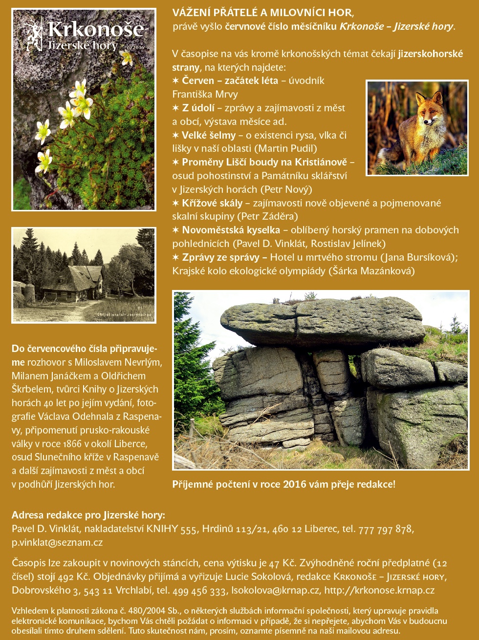 právě vyšlo červnové číslo měsíčníku Krkonoše – Jizerské hory. V časopise na vás kromě krkonošských témat čekají jizerskohorské strany, na kterých najdete: