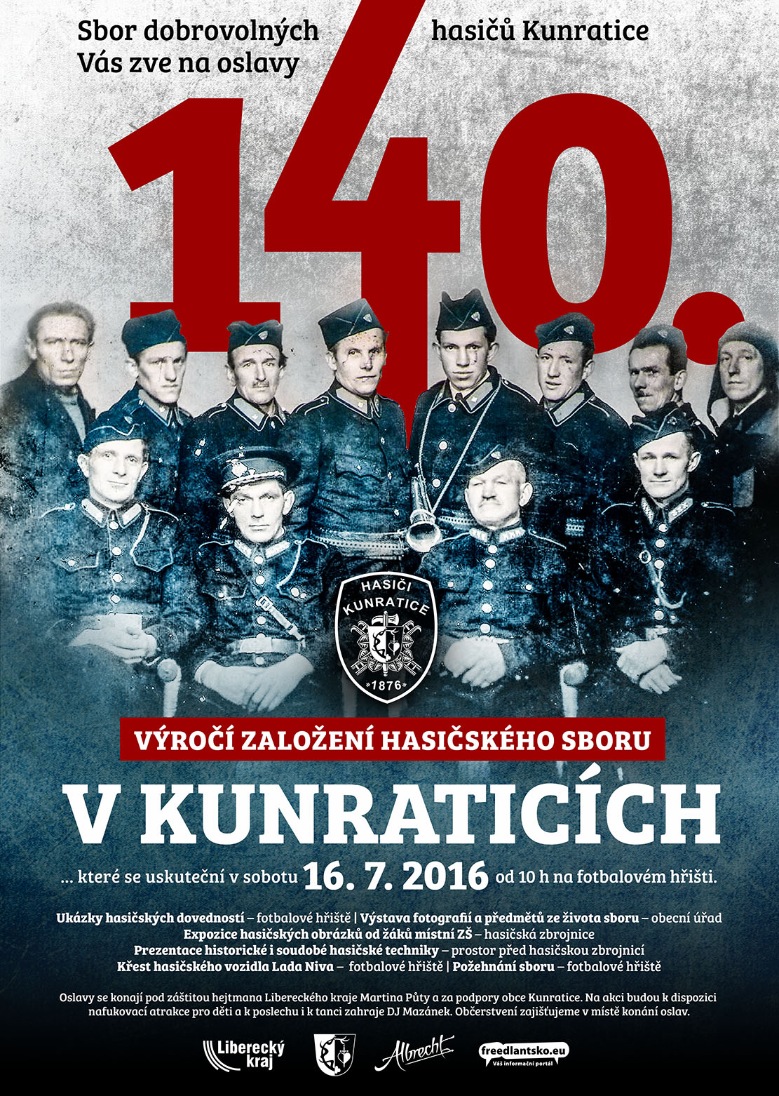 Sbor dobrovolných hasičů Kunratice Vás zve na oslavy 140. výročí založení hasičského sboru v Kunraticích, které se uskuteční v sobotu 16. 7. 2016 od 10 h na fotbalovém hřišti.