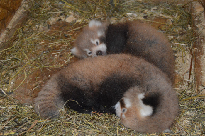 Pandí rodinka zatím obývá pro návštěvníky neviditelné prostory v zázemí své expozice. Mláďata už otvírají oči a začínají vnímat a prozkoumávat svět kolem sebe – ten prozatím tvoří pouze dřevěná porodní bouda.