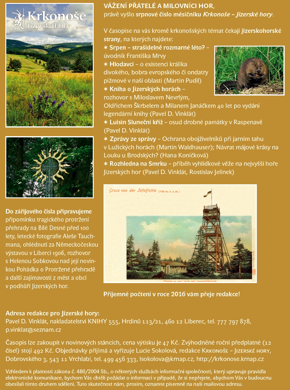 právě vyšlo srpnové číslo měsíčníku Krkonoše – Jizerské hory. V časopise na vás kromě krkonošských témat čekají jizerskohorské strany, na kterých najdete: