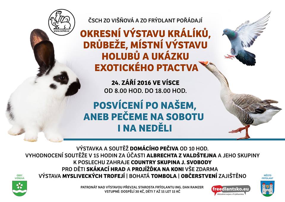 ČSCH ZO Višňová ZO Frýdlant pořádají Okresní výstavu králíků, drůbeže, místní výstavu holubů a ukázku exotického ptactva