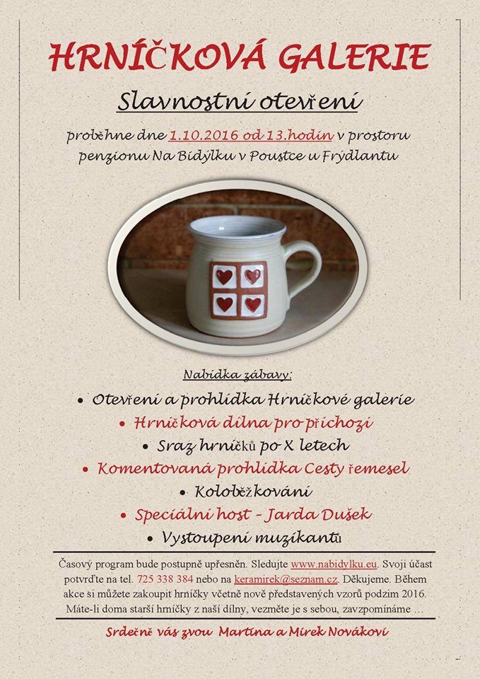 Slavnostní otevření proběhne dne 1. 10. 2016 od 13 hodin v prostoru penzionu Na Bidýlku v Poustce u Frýdlantu