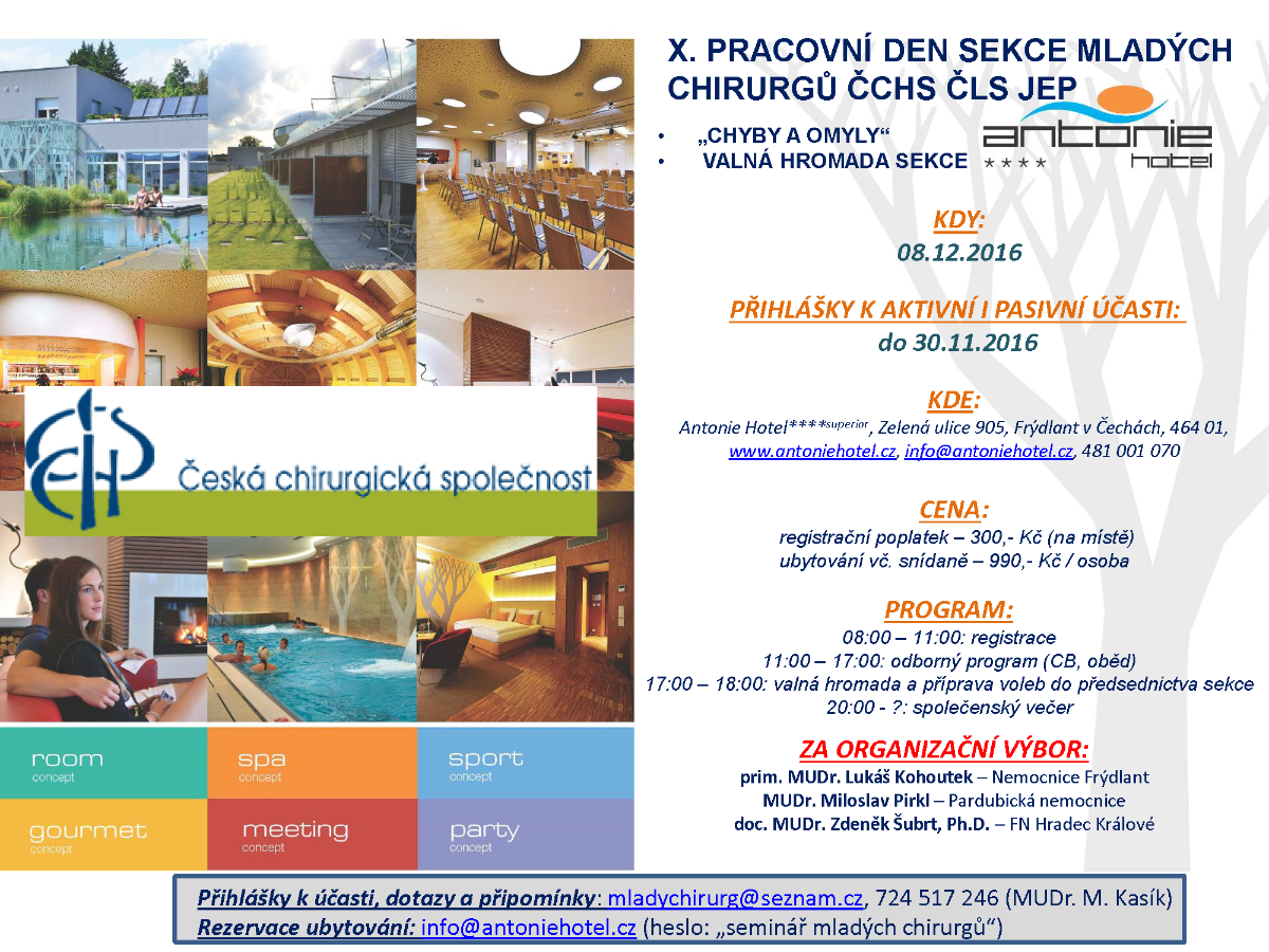 Do hotelu Antonie se sjedou mladí chirurgové z celé České republiky na svůj X. PRACOVNÍ DEN SEKCE MLADÝCH CHIRURGŮ České chirurgické společnosti ČLS JEP. V rámci organizačního výboru se příprav této akce aktivně účastní i lékaři z Nemocnice Frýdlant prim. MUDr. Kohoutek a MUDr. Pirkl. Aktivně se se svými odbornými přednáškami zapojí i další lékaři z frýdlantské nemocnice MUDr. Jakub Musil, MUDr. Barbara Karkošková a MUDr. Petra Plecháčová.